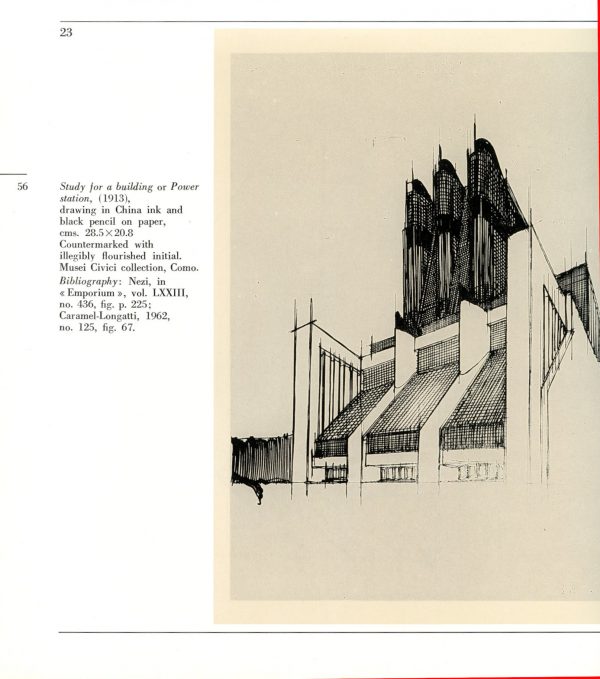 Come nel caso della mostra dedicata all’architetto Antonio Sant’Elia, uno dei padri fondatori del movimento futurista italiano in architettura principalmente ricordato per i suoi schizzi audaci che hanno profondamente influenzato l’architettura moderna, che venne organizzata da Olivetti in collaborazione con The Cooper Union for the Advancement of Science and Art e fu presentata nelle più prestigiose Università americane. In questo catalogo sono presentati 81 disegni di studi architettonici, datati tra il 1911 e il 1915, che descrivono dettagliatamente le opere di Antonio Sant’Elia esposte in mostra.